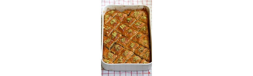 كف يك ظرف پيركس را چرب كنيد (با كره ي نرم يا روغن مايع ) الان خمير یوفكا در اندازه هاي متفاوت هست ، همه دايره هستند . ميتوانيد يك پيركس گرد اندازه ي يوفكايي كه خريده ايد انتخاب كنيد كه نياز به بريدن و اندازه كردن خمير هم نباشد . يك ورقه داخل ظرف بياندازيد . سطح روي ورقه را با قلم مو و كره ي نرم ، چرب كنيد ، باز يك ورقه ي ديگر بياندازيد . وچرب كنيد . اينكار را تا ده ورق ميتوانيد تكرار كنيد . به نظر من ٨ ورق كافيست . بعد بادام پوست گرفته ي چرخ كرده . يا گردوي خرد شده ، يا پسته ي چرخ شده روي ورقه ها بريزيد . اگر يك لايه بادام و يك لايه پسته بريزيد ، باقلوا دو رنگ ميشود . حالا يك ورقه ي يوفكا روي بادام بگذاريد و با دست به صورت يكنواخت همه جا را كمي فشار دهيد . بعد سطح يوفكا را با كره ي نرم چرب كنيد . واينكار را تا هفت لايه ي ديگر يوفكا تكرار كنيد . چرب كردن فراموش نشود . اخرين ورقه را كه گذاشتيد ، با يك چاقوي نازك تيز ، به صورت لوزي يا چهار گوش ، برش بزنيد . كمي كره آب كنيد و روي باقلوا داغ داغ بريزيد و در فر ١٨٠ درجه تا طلايي شدن بپزيد . در اين فاصله شهد درست كنيد .