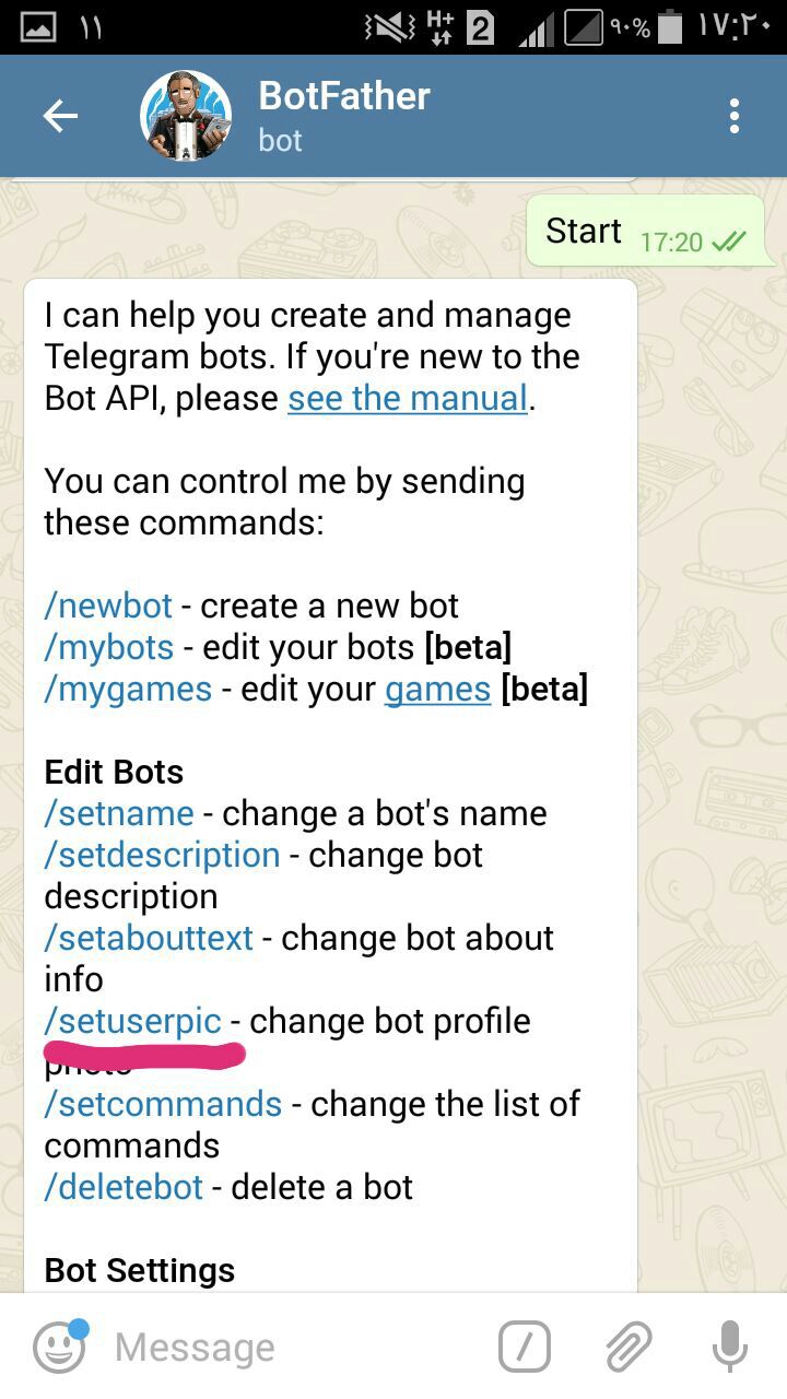 🔅 برای ثبت عکس بات خود به @BotFather مراجعه کنید و دستور setuserpic/ را وارد نمایید, سپس عکس مورد نظر خود را ارسال کنید. برای تغییر عکس می توانید همین مراحل را تکرار کنید. (عکس ارسالی باید آپلود شود و نباید از کانال یا گروه دیگر فوروارد شود)