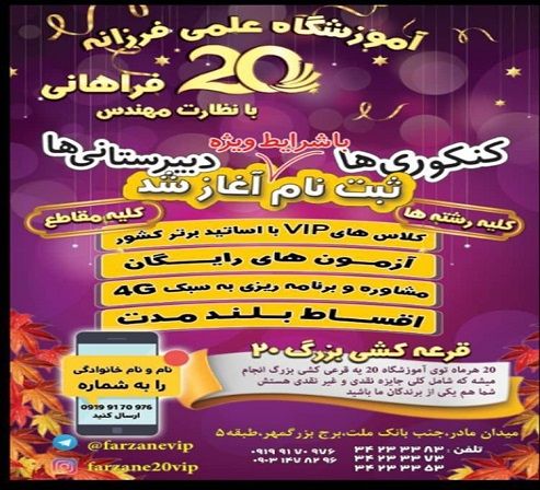 بخش مشاوره فرزانه 20 با پتانسیلی بالا و قوی در جهت ارتقاء سطح علمی دانش آموزان عزیز در حال خدمت رسانی می باشد.
